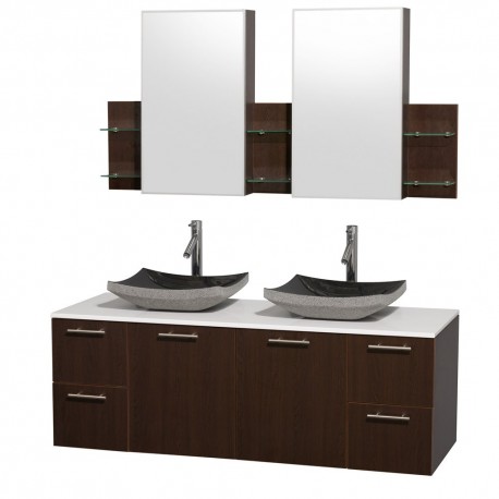60 inch Double Bathroom Vanity in Espresso with White Man-Made Stone Top with Black Granite Sinks, and Medicine Cabinets