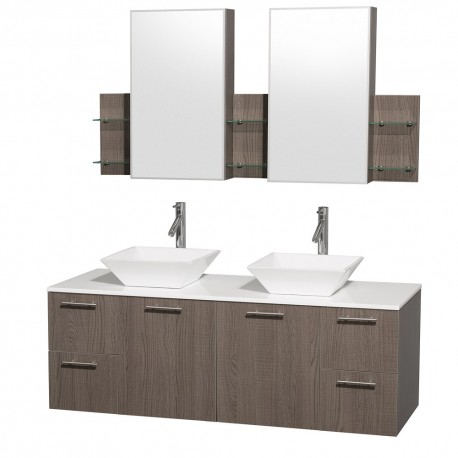 60 inch Double Bathroom Vanity in Gray Oak with White Man-Made Stone Top with White Porcelain Sinks, and Medicine Cabinets