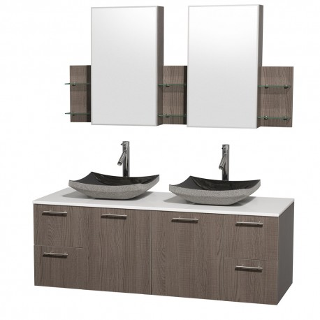 60 inch Double Bathroom Vanity in Gray Oak with White Man-Made Stone Top with Black Granite Sinks, and Medicine Cabinets