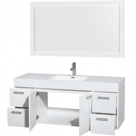 60 inch Single Bathroom Vanity in Glossy White, Acrylic Resin Countertop, Integrated Sink, and 58 inch Mirror