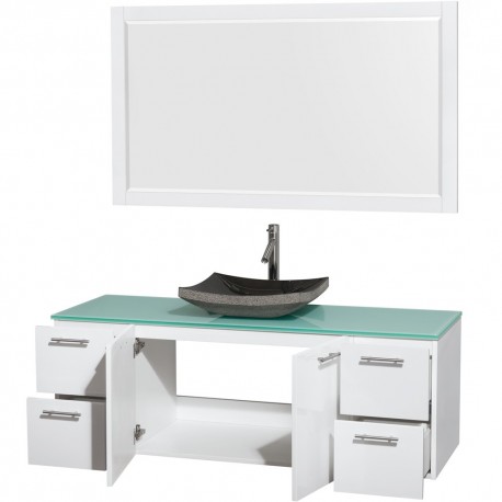 60 inch Single Bathroom Vanity in Glossy White, Green Glass Countertop, Altair Black Granite Sink, and 58 inch Mirror