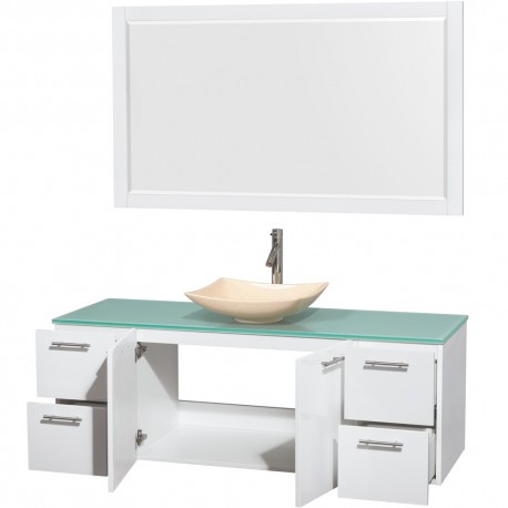 60 inch Single Bathroom Vanity in Glossy White, Green Glass Countertop, Arista Ivory Marble Sink, and 58 inch Mirror
