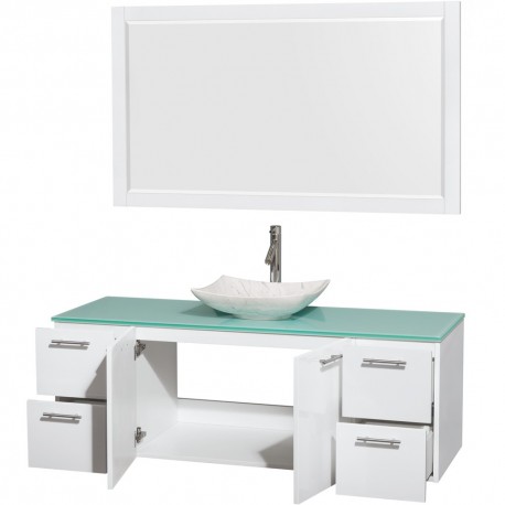 60 inch Single Bathroom Vanity in Glossy White, Green Glass Countertop, Arista White Carrera Marble Sink, and 58 inch Mirror