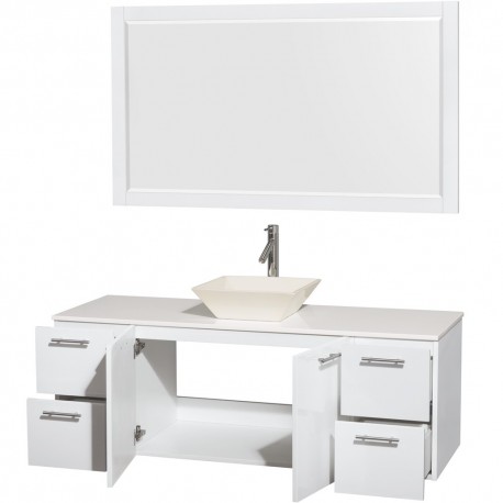 60 inch Single Bathroom Vanity in Glossy White, White Man-Made Stone Countertop, Pyra Bone Porcelain Sink, and 58 inch Mirror