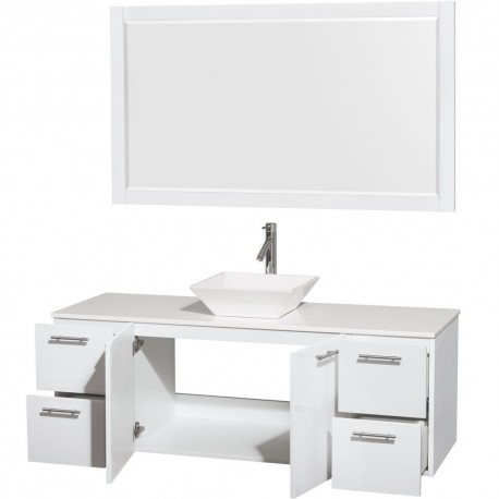 60 inch Single Bathroom Vanity in Glossy White, White Man-Made Stone Countertop, Pyra White Sink, and 58 inch Mirror