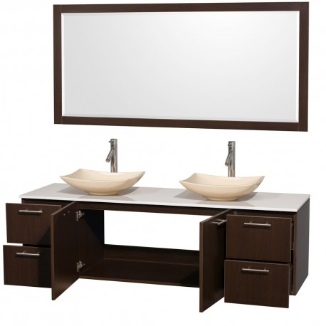 72 inch Double Bathroom Vanity in Espresso, White Man-Made Stone Countertop, Arista Ivory Marble Sinks, and 70 inch Mirror