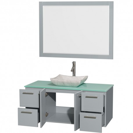 48 inch Single Bathroom Vanity in Dove Gray, Green Glass Countertop, Avalon White Carrera Marble Sink, and 46 inch Mirror