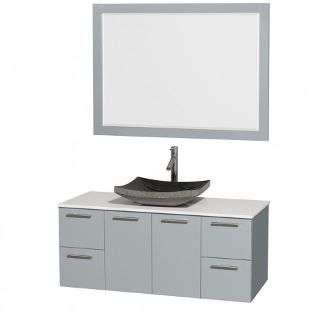 48 inch Single Bathroom Vanity in Dove Gray, White Man-Made Stone Countertop, Altair Black Granite Sink, and 46 inch Mirror