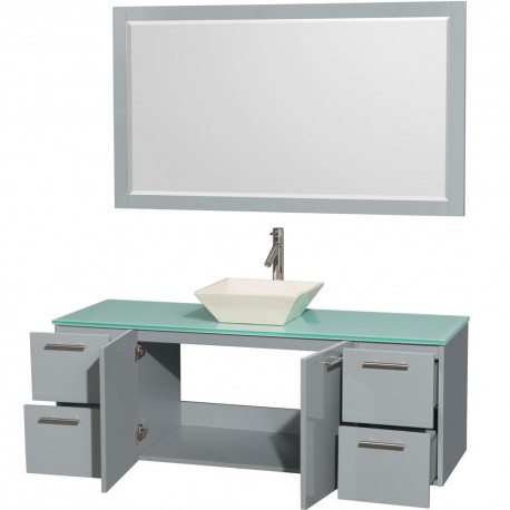60 inch Single Bathroom Vanity in Dove Gray, Green Glass Countertop, Pyra Bone Porcelain Sink, and 58 inch Mirror
