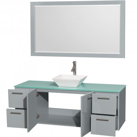 60 inch Single Bathroom Vanity in Dove Gray, Green Glass Countertop, Pyra White Porcelain Sink, and 58 inch Mirror