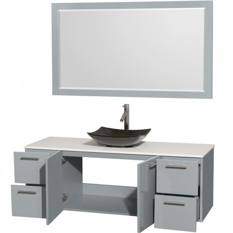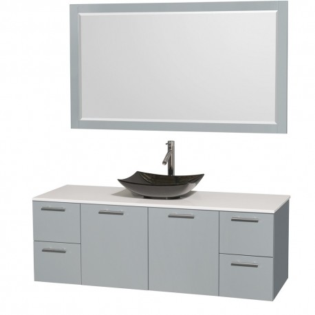 60 inch Single Bathroom Vanity in Dove Gray, White Man-Made Stone Countertop, Arista Black Granite Sink, and 58 inch Mirror