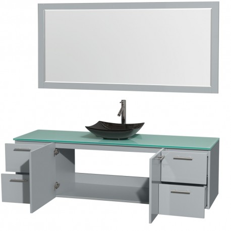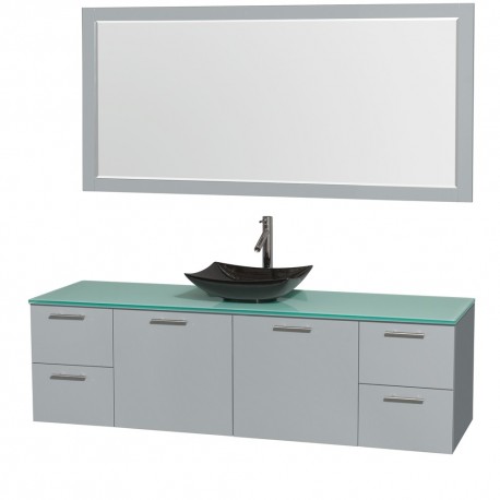 72 inch Single Bathroom Vanity in Dove Gray, Green Glass Countertop, Arista Black Granite Sink, and 70 inch Mirror