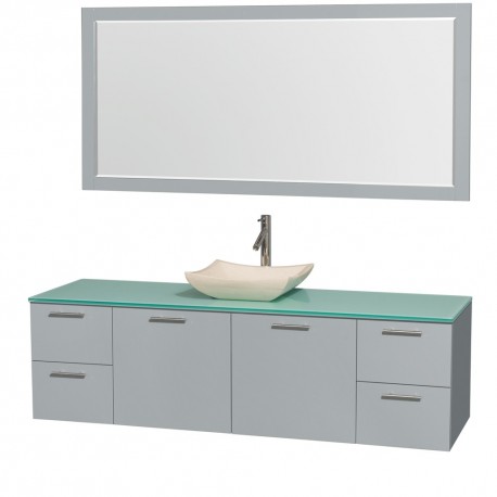 72 inch Single Bathroom Vanity in Dove Gray, Green Glass Countertop, Avalon Ivory Marble Sink, and 70 inch Mirror