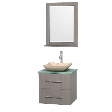 24 inch Single Bathroom Vanity in Gray Oak, Green Glass Countertop, Avalon Ivory Marble Sink, and 24 inch Mirror