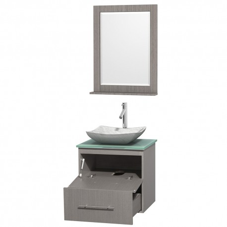 24 inch Single Bathroom Vanity in Gray Oak, Green Glass Countertop, Avalon White Carrera Marble Sink, and 24 inch Mirror
