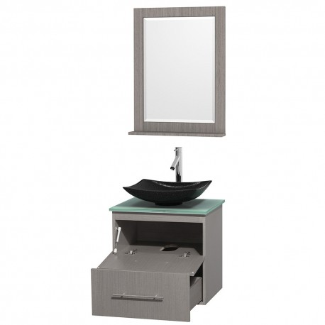 24 inch Single Bathroom Vanity in Gray Oak, Green Glass Countertop, Arista Black Granite Sink, and 24 inch Mirror