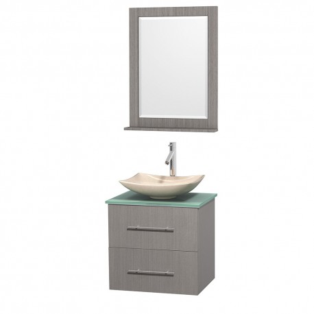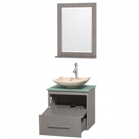 24 inch Single Bathroom Vanity in Gray Oak, Green Glass Countertop, Arista Ivory Marble Sink, and 24 inch Mirror