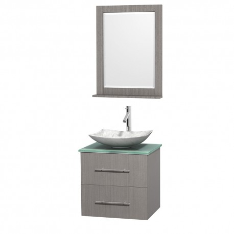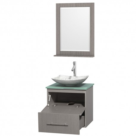 24 inch Single Bathroom Vanity in Gray Oak, Green Glass Countertop, Arista White Carrera Marble Sink, and 24 inch Mirror