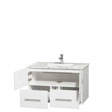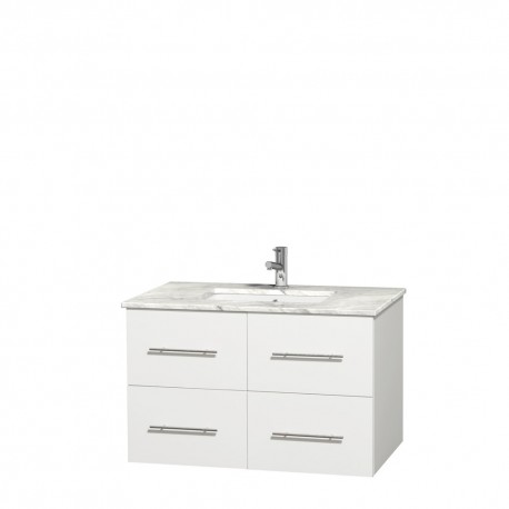 36 inch Single Bathroom Vanity in Matte White, White Carrera Marble Countertop, Undermount Square Sink, and No Mirror