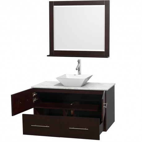 42 inch Single Bathroom Vanity in Espresso, White Carrera Marble Countertop, Pyra White Porcelain Sink, and 36 inch Mirror