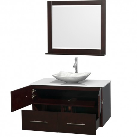 42 inch Single Bathroom Vanity in Espresso, White Man-Made Stone Countertop, Arista White Carrera Marble Sink, and 36 inch Mirror