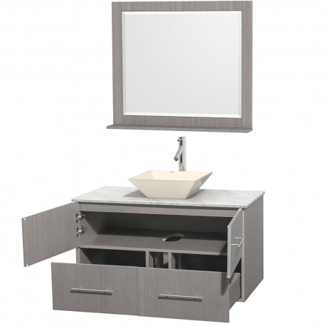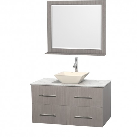 42 inch Single Bathroom Vanity in Gray Oak, White Carrera Marble Countertop, Pyra Bone Porcelain Sink, and 36 inch Mirror