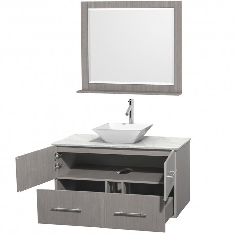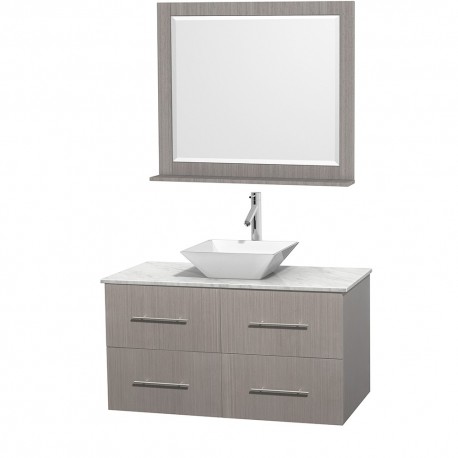 42 inch Single Bathroom Vanity in Gray Oak, White Carrera Marble Countertop, Pyra White Porcelain Sink, and 36 inch Mirror