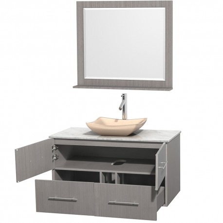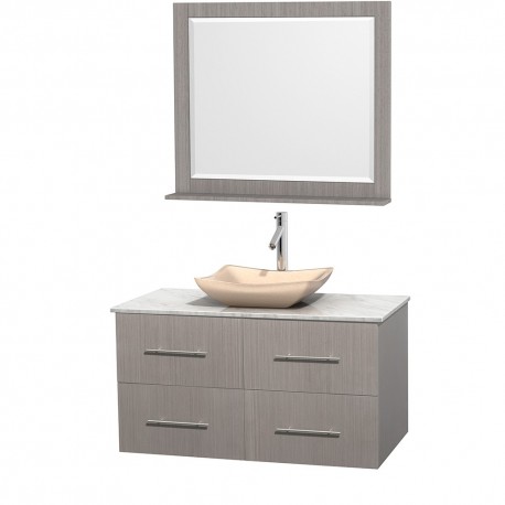 42 inch Single Bathroom Vanity in Gray Oak, White Carrera Marble Countertop, Avalon Ivory Marble Sink, and 36 inch Mirror