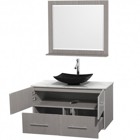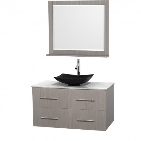 42 inch Single Bathroom Vanity in Gray Oak, White Carrera Marble Countertop, Arista Black Granite Sink, and 36 inch Mirror