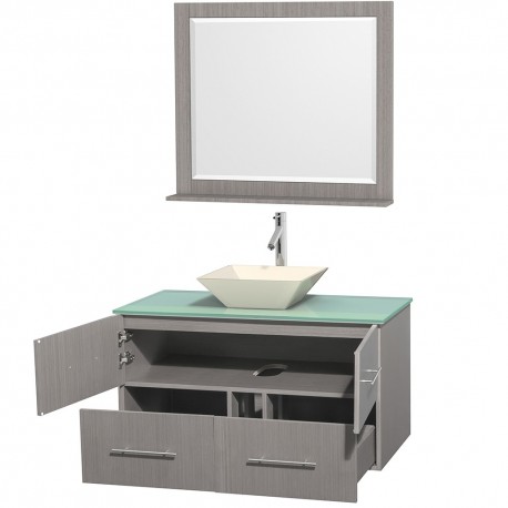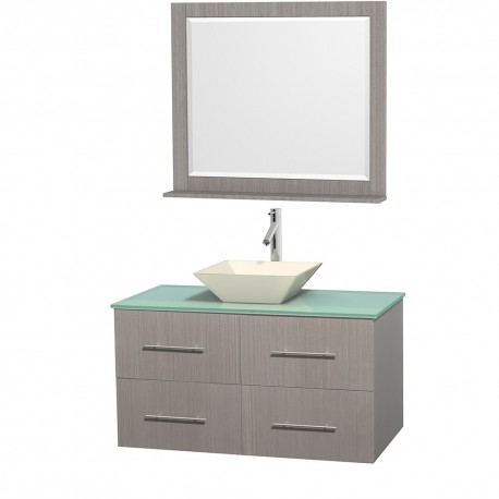 42 inch Single Bathroom Vanity in Gray Oak, Green Glass Countertop, Pyra Bone Porcelain Sink, and 36 inch Mirror