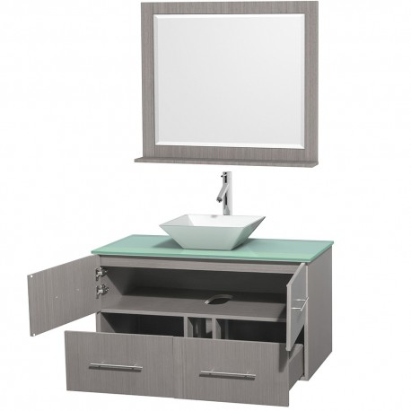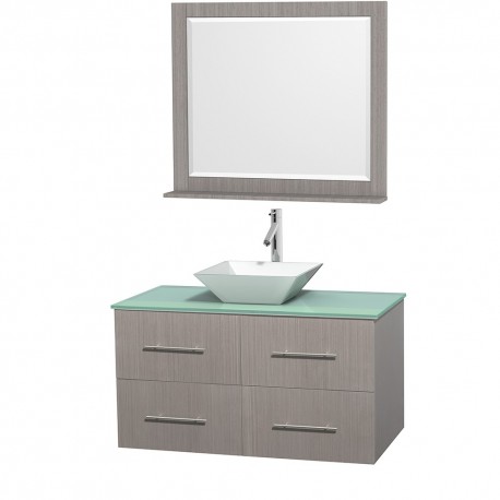 42 inch Single Bathroom Vanity in Gray Oak, Green Glass Countertop, Pyra White Porcelain Sink, and 36 inch Mirror