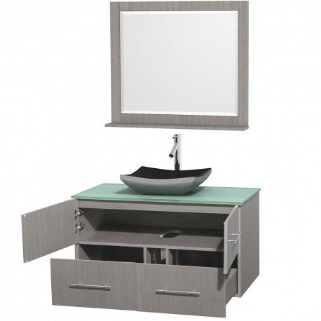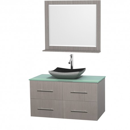 42 inch Single Bathroom Vanity in Gray Oak, Green Glass Countertop, Altair Black Granite Sink, and 36 inch Mirror