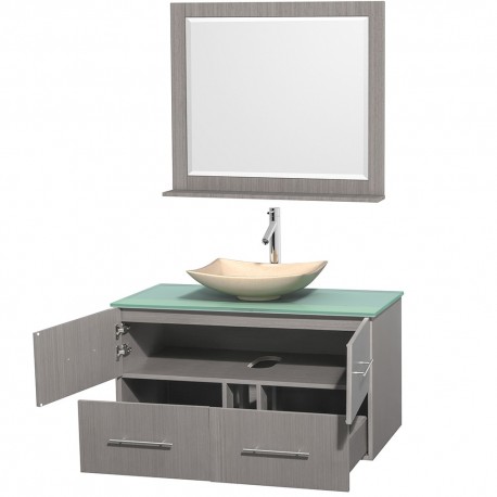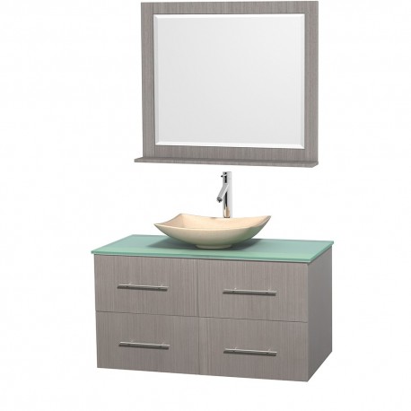 42 inch Single Bathroom Vanity in Gray Oak, Green Glass Countertop, Arista Ivory Marble Sink, and 36 inch Mirror