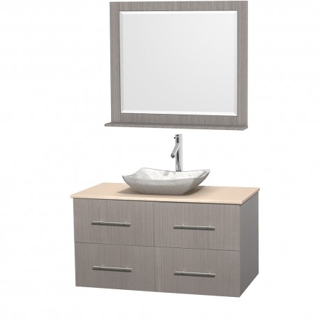 42 inch Single Bathroom Vanity in Gray Oak, Ivory Marble Countertop, Avalon White Carrera Marble Sink, and 36 inch Mirror