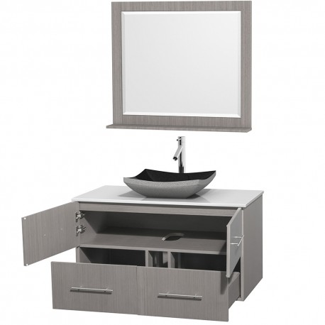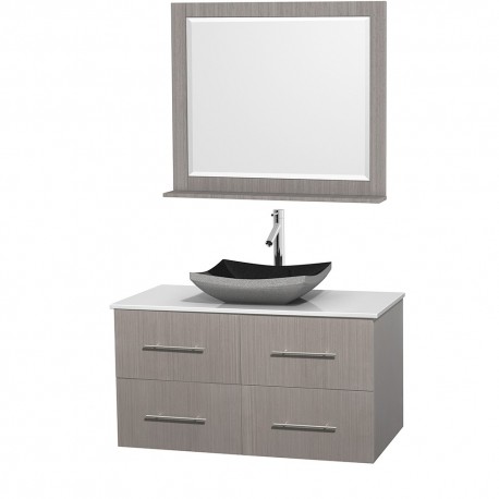 42 inch Single Bathroom Vanity in Gray Oak, White Man-Made Stone Countertop, Altair Black Granite Sink, and 36 inch Mirror