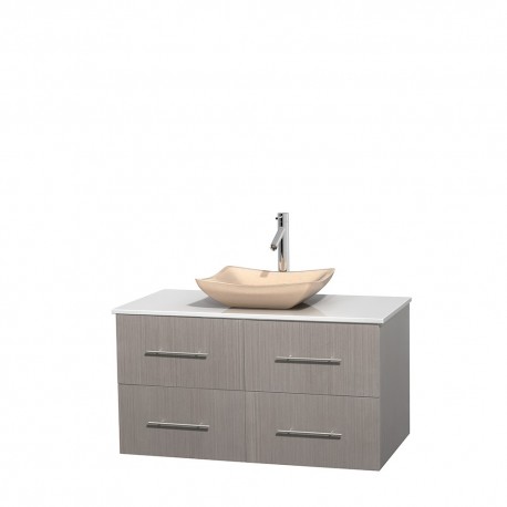 42 inch Single Bathroom Vanity in Gray Oak, White Man-Made Stone Countertop, Avalon Ivory Marble Sink, and No Mirror