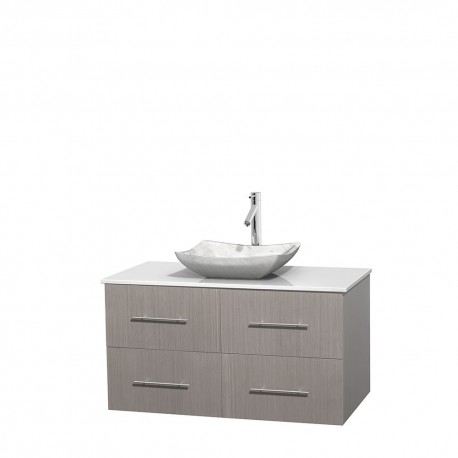 42 inch Single Bathroom Vanity in Gray Oak, White Man-Made Stone Countertop, Avalon White Carrera Marble Sink, and No Mirror