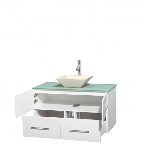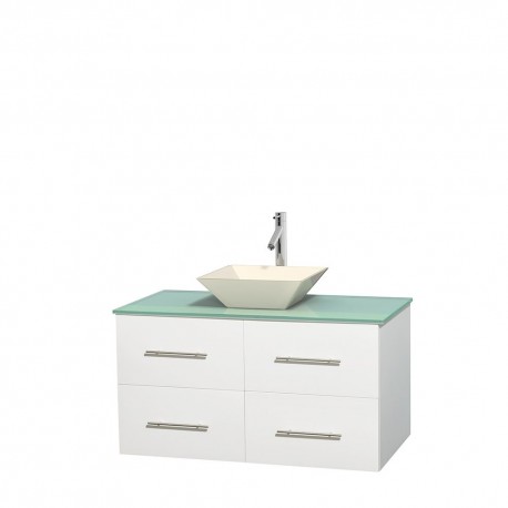 42 inch Single Bathroom Vanity in Matte White, Green Glass Countertop, Pyra Bone Porcelain Sink, and No Mirror
