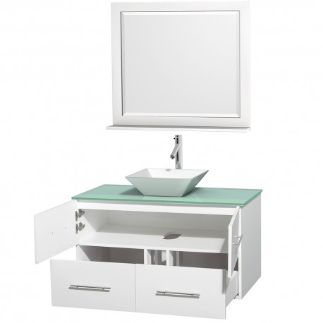42 inch Single Bathroom Vanity in Matte White, Green Glass Countertop, Pyra White Porcelain Sink, and 36 inch Mirror