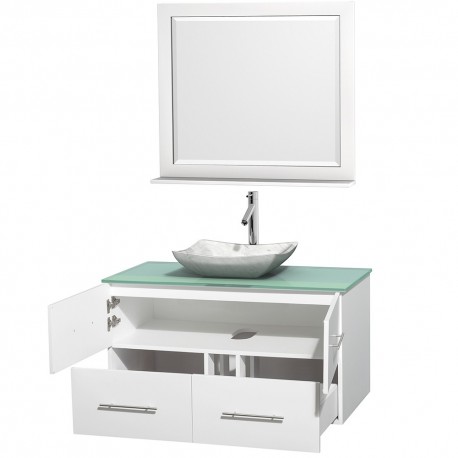42 inch Single Bathroom Vanity in Matte White, Green Glass Countertop, Avalon White Carrera Marble Sink, and 36 inch Mirror