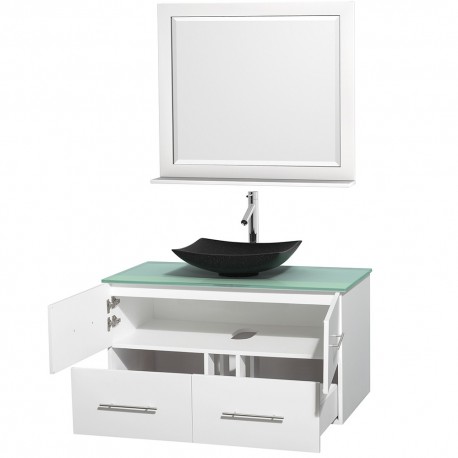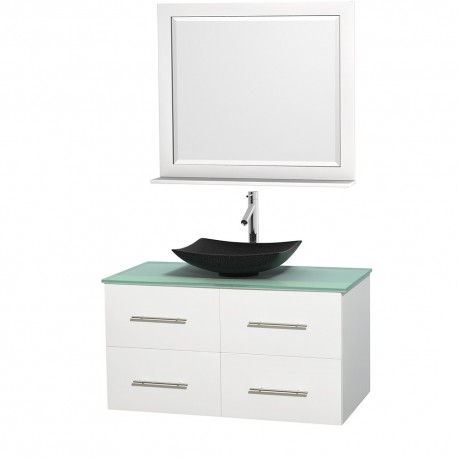 42 inch Single Bathroom Vanity in Matte White, Green Glass Countertop, Arista Black Granite Sink, and 36 inch Mirror