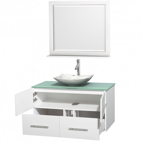 42 inch Single Bathroom Vanity in Matte White, Green Glass Countertop, Arista White Carrera Marble Sink, and 36 inch Mirror