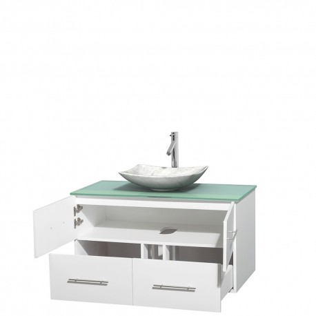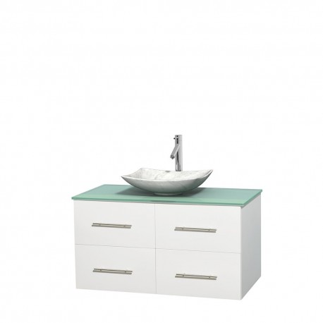 42 inch Single Bathroom Vanity in Matte White, Green Glass Countertop, Arista White Carrera Marble Sink, and No Mirror