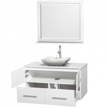 42 inch Single Bathroom Vanity in Matte White, White Man-Made Stone Countertop, Avalon White Carrera Marble Sink, and 36 inch Mirror