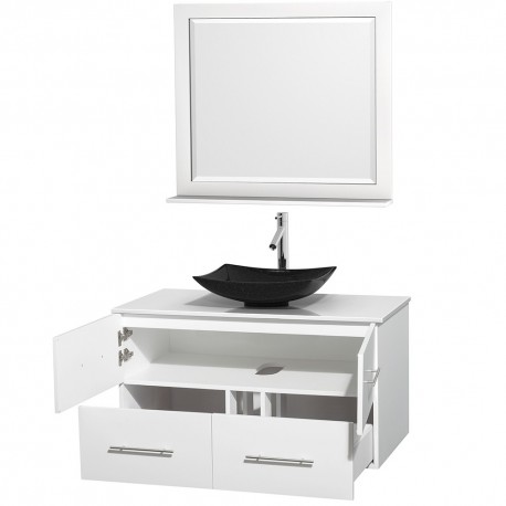 42 inch Single Bathroom Vanity in Matte White, White Man-Made Stone Countertop, Arista Black Granite Sink, and 36 inch Mirror