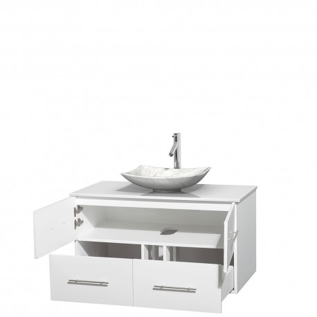 42 inch Single Bathroom Vanity in Matte White, White Man-Made Stone Countertop, Arista White Carrera Marble Sink, and No Mirror