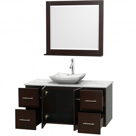 48 inch Single Bathroom Vanity in Espresso, White Carrera Marble Countertop, Avalon White Carrera Marble Sink, and 36 inch Mirror