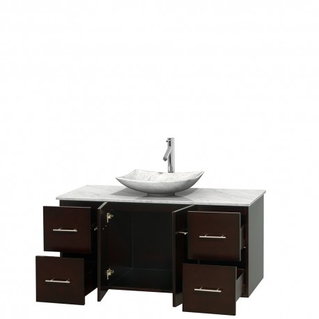 48 inch Single Bathroom Vanity in Espresso, White Carrera Marble Countertop, Arista White Carrera Marble Sink, and No Mirror