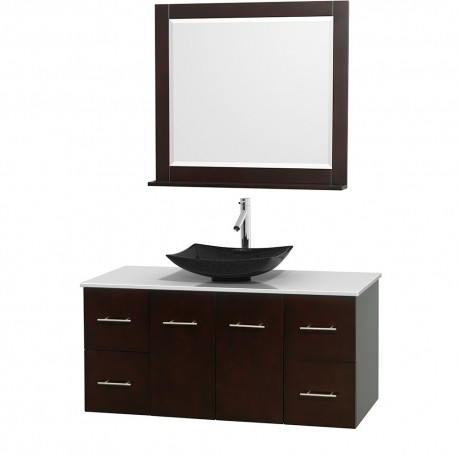 48 inch Single Bathroom Vanity in Espresso, White Man-Made Stone Countertop, Arista Black Granite Sink, and 36 inch Mirror