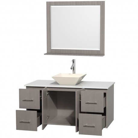 48 inch Single Bathroom Vanity in Gray Oak, White Man-Made Stone Countertop, Pyra Bone Porcelain Sink, and 36 inch Mirror